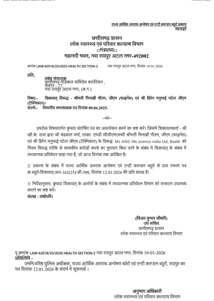 पत्र में उल्लेख है कि तत्कालीन एमडी CGMSC चंद्रकांत वर्मा, तत्कालीन जीएम (फाइनेंस)मीनाक्षी गौतम एवं जीएम (टेक्निकल) हिरन मनुभाई पटेल के विरुद्ध Ms ANG Life Science India Ltd, को नियम विरुद्ध तरीके से शासकीय करोड़ों रुपये का भुगतान किए जाने संबंध में शिकायत की गई थी। इस शिकायत पर विभाग द्वारा तथ्यात्मक प्रतिवेदन चाहा गया था, जो आज दिनांक तक अपेक्षित है।