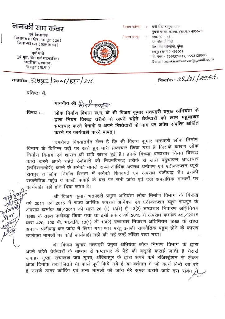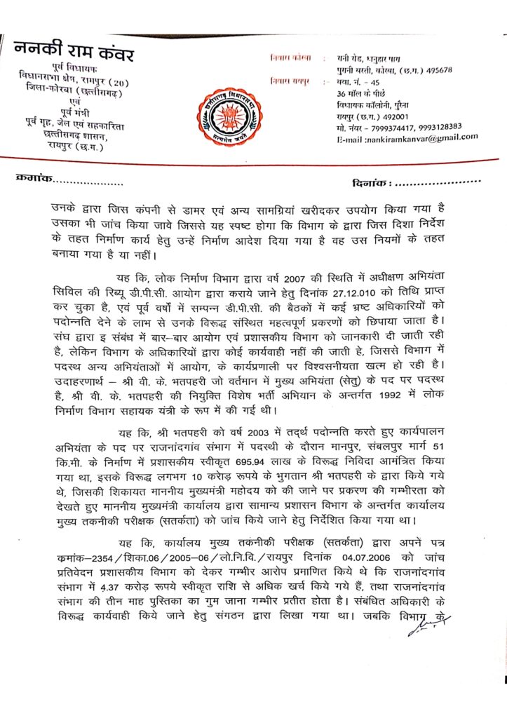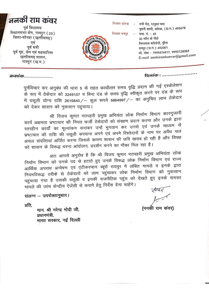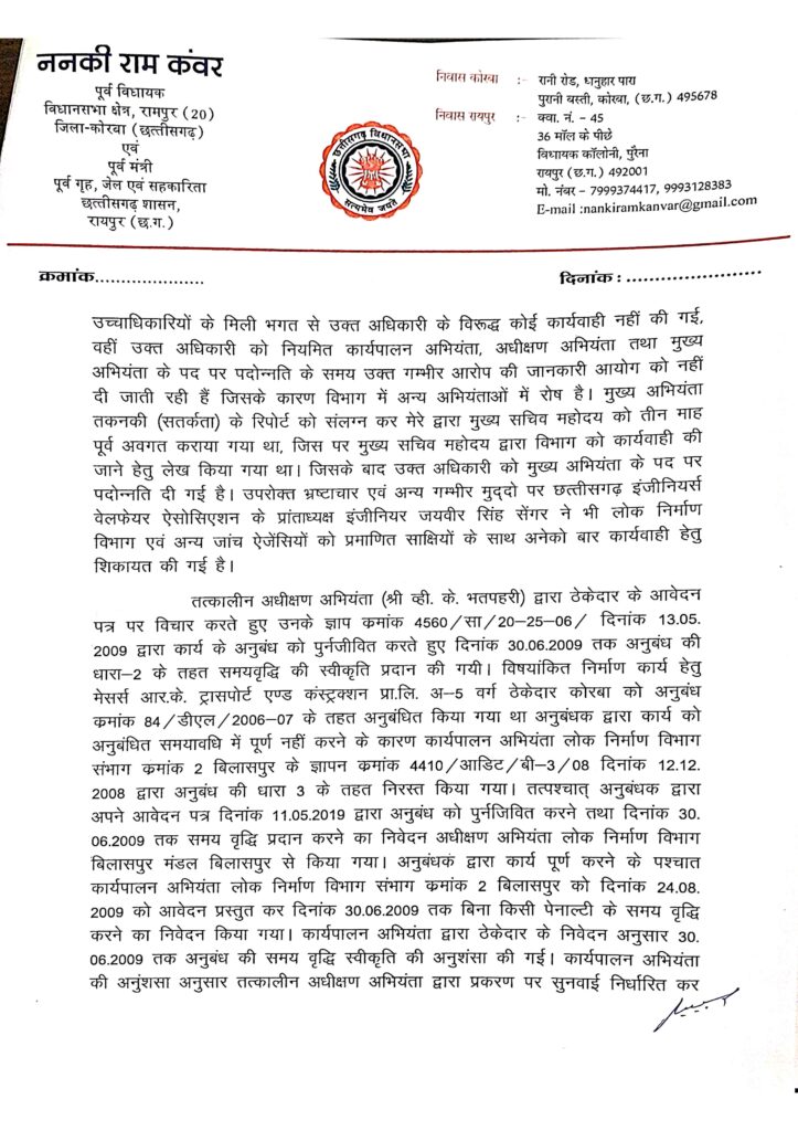 रायपुर ब्यूरो/ किसी भी सरकार की असली परीक्षा केवल घोषणाओं और योजनाओं से नहीं होती, बल्कि इस बात से होती है कि वह किस तरह के अधिकारियों को अपने सबसे महत्वपूर्ण विभागों में बनाए रखती है। छत्तीसगढ़ का लोक निर्माण विभाग ऐसा ही एक संवेदनशील विभाग है, जहां सड़क, पुल और बुनियादी ढांचे के साथ-साथ सरकार की साख भी दांव पर रहती है। आज यही साख उस समय सवालों में घिरती दिख रही है, जब गंभीर आरोपों से घिरे अधिकारी विभाग के प्रमुख अभियंता विजय कुमार भतपहरी का नाम बार-बार सामने आ रहा है। छत्तीसगढ़ के पूर्व गृह मंत्री ननकी राम कंवर ने प्रधानमंत्री, मुख्यमंत्री और लोक निर्माण मंत्री छत्तीसगढ़ को पत्र लिखकर इनकी कथित करगुजारियों से अवगत कराया है और इन पर कार्रवाई करने की बात कही है। इस समाचार में श्री कंवर के पत्र और उनके द्वारा उपलब्ध कराए गए दस्तावेजों को पढ़कर रॉ फाइल ने भी अपने समीक्षात्मक विचार रखे है।